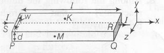 In a thin rectangular metallic strip, a constant current I flows along the positive x-direction, as shown in the figure. The length, width and thickness of the strip are l, w and d respectively. A uniform magnetic field B is applied on the strip along the positive y-direction. Due to this, the charge carriers experience a net deflection along the z-direction. This results in the accumulation of charge carries on the surface PQRS and the appearance of equal and opposite charges on the face opposite to PQRS. A potential difference along the z-direction is thus developed. Charge accumulation continues untill the magnetic force is balanced by the electric force. The current is assumed to be uniformly distributed on the cross-section of the strip and carried by electrons.