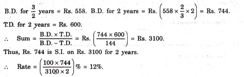 4.The banker's discount on a sum of money for 1(1/2) years is Rs. 558 and the true discount on the same sum for 2 years is Rs. 600. The rate percent is : A) 10% B) 13% C) 12% D) 15% View Answer Report DiscussAnswer: Option CExplanation: