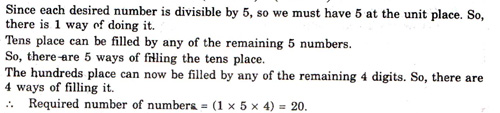 3.How many 3-digit numbers can be formed from the digits 2, 3, 5,6, 7 and 9, which are divisible by 5 and none of the digits is repeated ? A) 5 B) 10 C) 15 D) 20 View Answer Report DiscussAnswer: Option DExplanation: