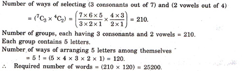 1.Out of 7 consonants and 4 vowels, how many words of 3 consonants and 2 vowels can be formed ? A) 210 B) 1050 C) 25200 D) 21400 E) None of these View Answer Report DiscussAnswer: Option CExplanation: