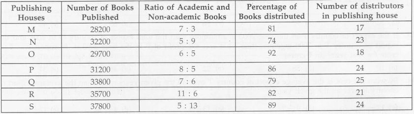 5.What is the difference between the number of academic books published by publishing house M and P? A) 450 B) 640 C) 540 D) 504 E) None of these View Answer Report DiscussAnswer: Option CExplanation:Difference between numbers of books published by publishing house M and P = $\frac{7}{10}\times28200$ - $\frac{8}{12}\times31200$ = 19740 - 19200 = 540