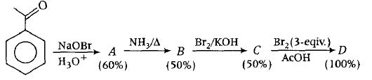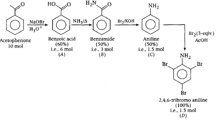 In the following reactions sequence, the amount of D (in gram) formed from 10 moles of acetophenone is ...........